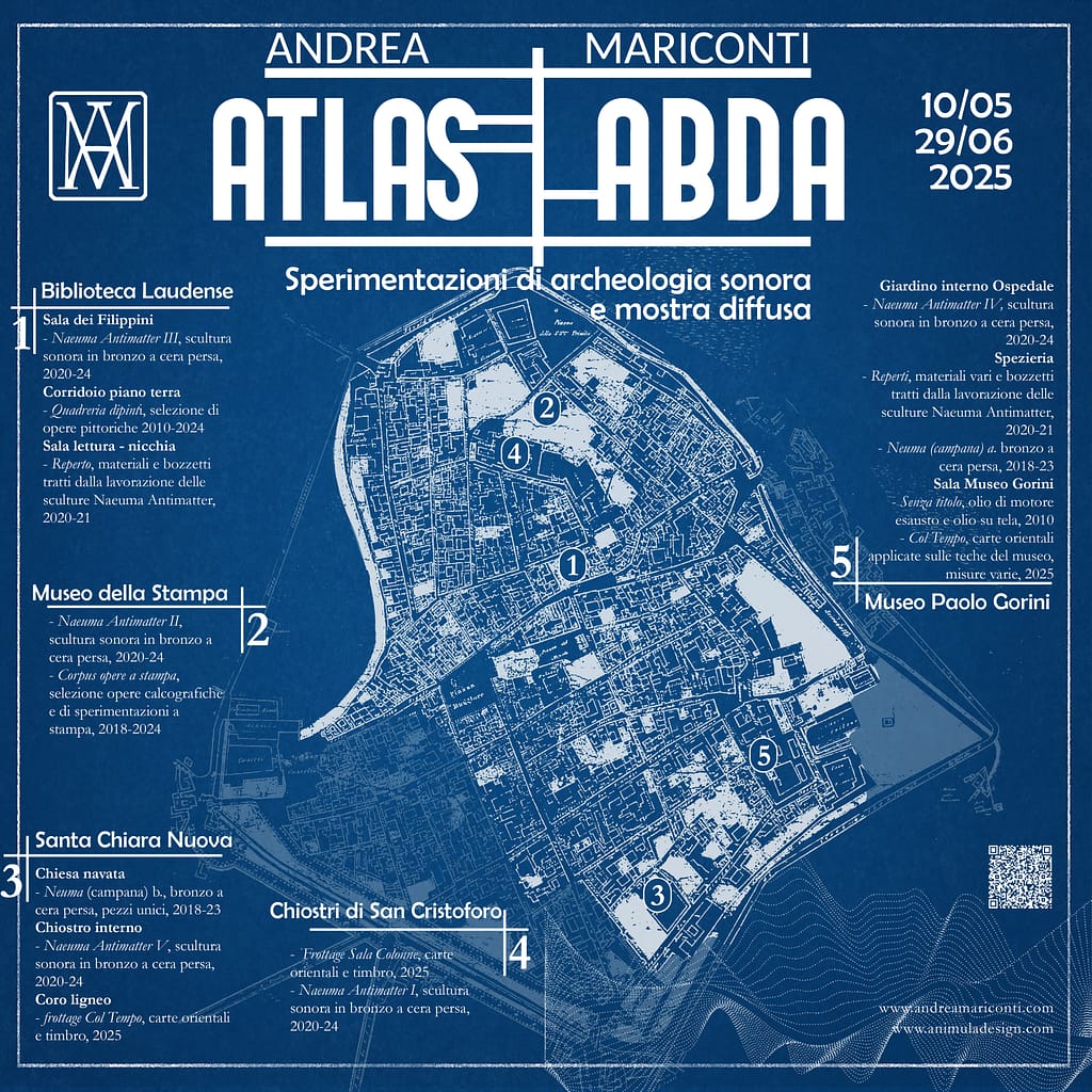 The project’s ideal driving force is, in fact, an experimental concept of “sound archaeology” thanks to the lost-wax bronze sculptures of the Naeuma-Antimatter series. The artist has brought these works, capable of resonating like real musical instruments, to a symbolic location in the underground of Lodi: the Hall of Columns of the former monastery of San Domenico, making the spaces vibrate with them. This performance is available for listening on the artist’s website andreamariconti.com and also through QR codes scattered throughout the exhibition.